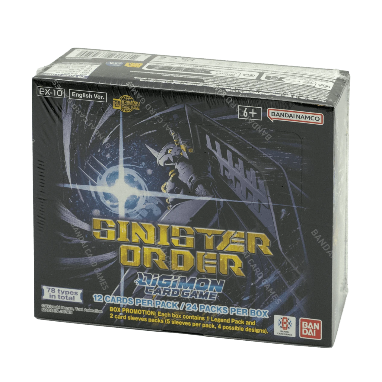 The Digimon Card Game EX-10 “Sinister Order” Extra Booster Display includes 24 booster packs, each containing 12 cards. This set brings together powerful villain Digimon and rival forces from multiple anime series, including BlackWarGreymon, Close, Sunarizamon and Yujin Ozora (from Digimon Universe App Monsters). Box-purchase bonus sleeves featuring enemy Digimon are also included to enhance the collection.