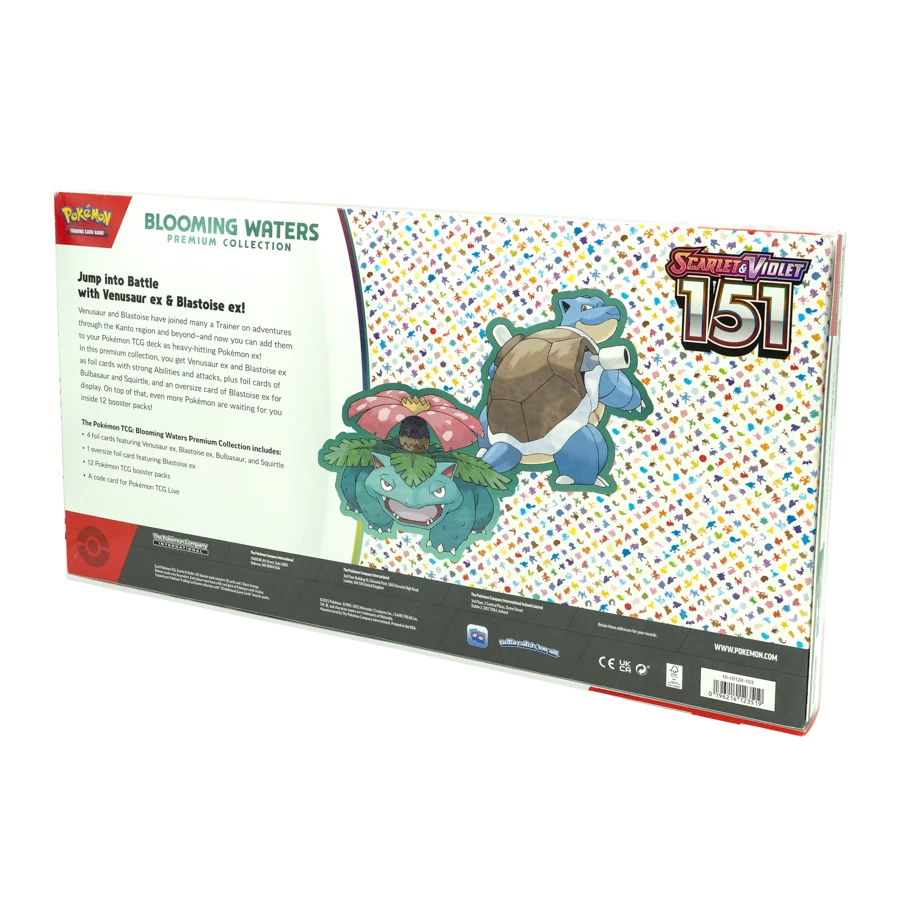 The Pokemon Trading Card Game Scarlet & Violet – 151 – Blooming Waters Premium Collection celebrates Water-type Pokemon from the original 151 Kanto Pokemon. This premium box features exclusive foil promo cards of iconic Water-type Pokemon from the first generation, reimagined with the Scarlet & Violet card design. The collection offers an elegant showcase of aquatic Pokemon in a premium package for dedicated collectors.