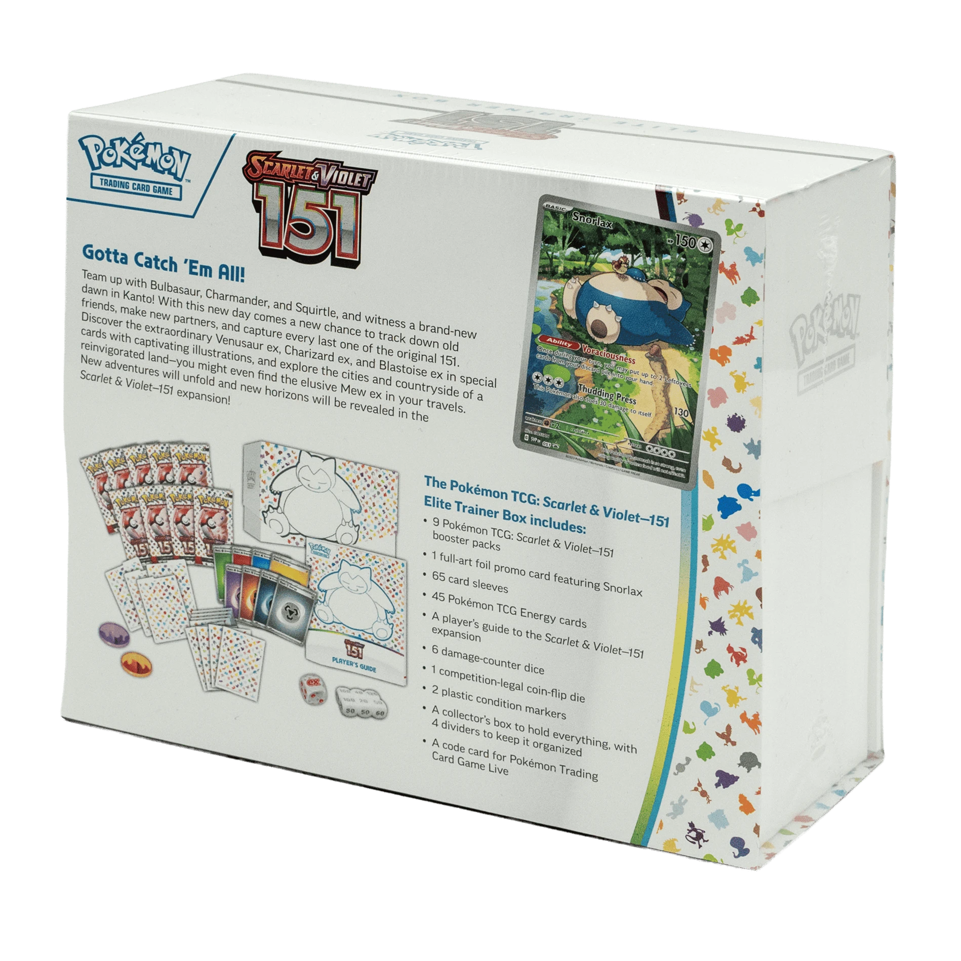 The Pokemon Trading Card Game Scarlet & Violet 151 Elite Trainer Box celebrates the original 151 Pokemon from the Kanto region, reimagined with modern Scarlet & Violet series mechanics and artwork. This special set features all 151 original Pokemon from the first generation, with their card numbers corresponding to their Pokedex entries, creating a nostalgic yet fresh collecting experience. The packaging features iconic first-generation Pokemon like Pikachu, the three original starters, and Mew, setting the tone for this tribute to Pokemon’s origins.